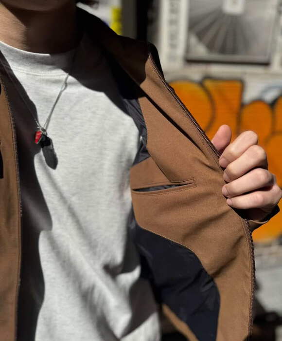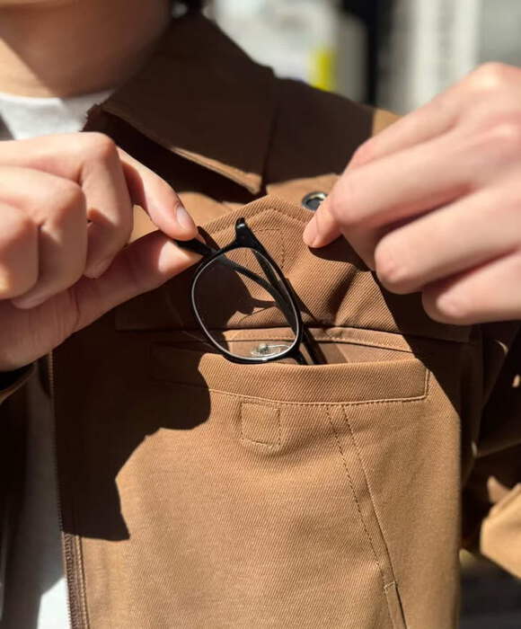 外套著用WISDOM科技單寧外套,極簡風的剪裁配上防潑水質地,非常符合都市機能的穿搭特性。