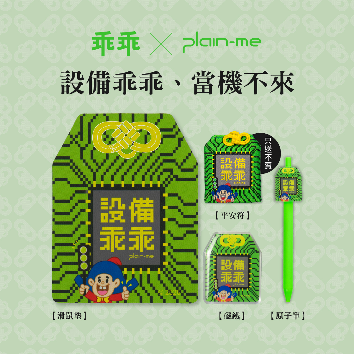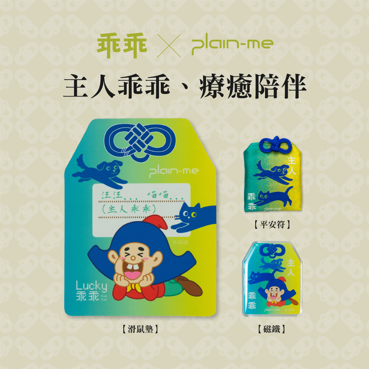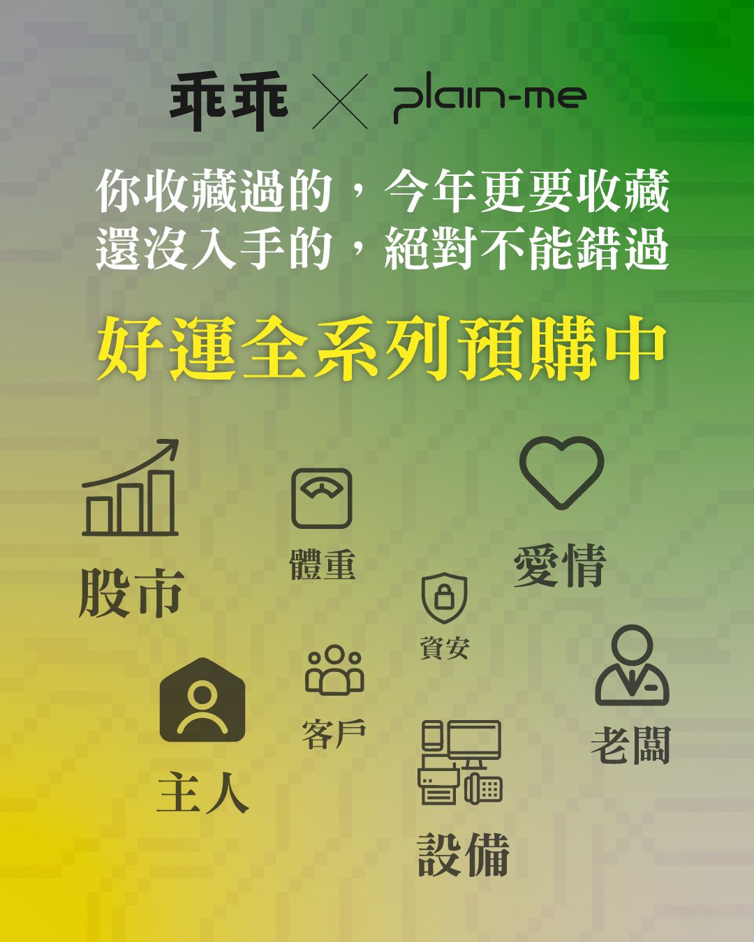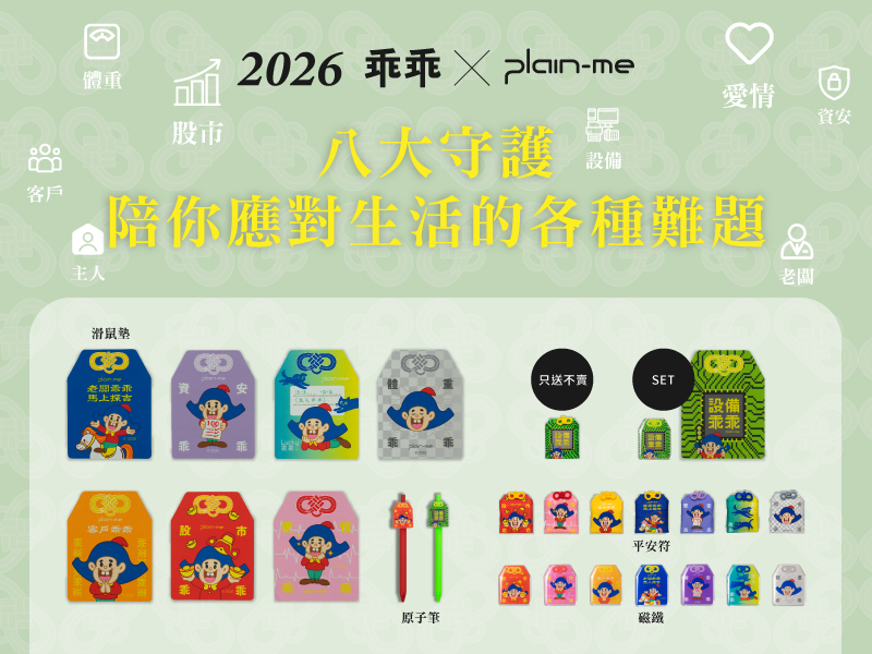 今年,我們不再只專注於單一的綠色守護,而是將這份傳承三年的默契,轉化為八大生存議題。從保佑提案必過的「客戶」、守護財富的「股市」,到關乎幸福感的「愛情」與「寵物」,plain-me 將乖乖神力具象化為平安符、磁鐵、滑鼠墊與原子筆。
