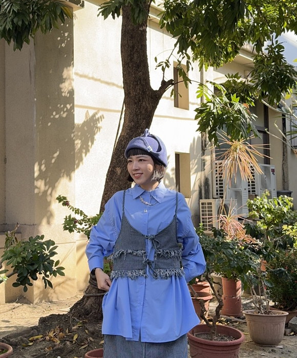 以清新的藍襯衫打底,疊穿刷鬚細節背心,讓整體更有層次與個性。