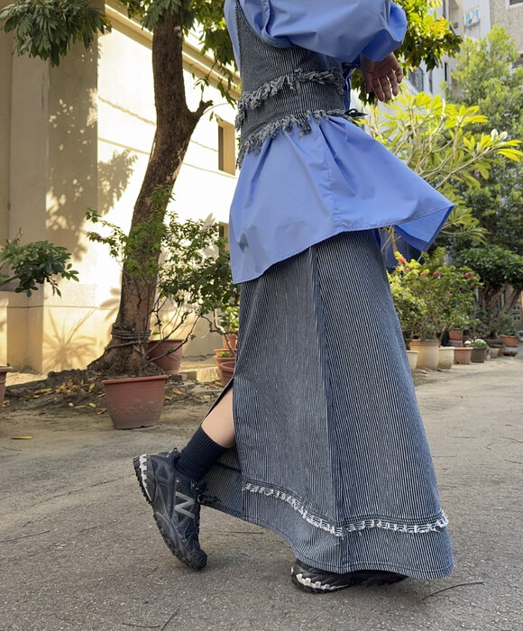 長版條紋裙修飾身形,搭配運動鞋混搭出輕鬆率性的氛圍。