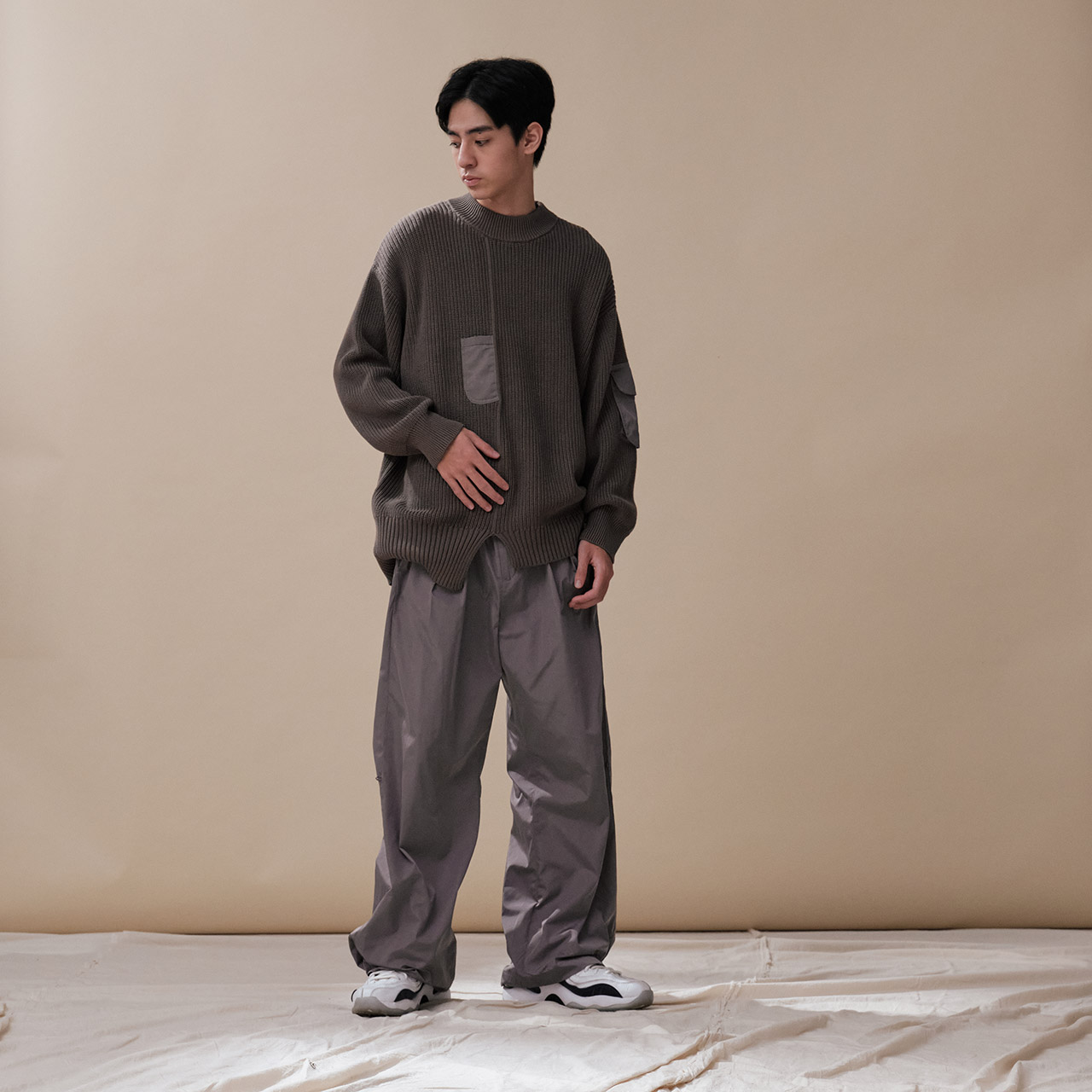 - 100%棉料針織X光澤尼龍:厚實舒適的棉質粗針織,搭配帶有金屬光澤的斜尼龍料,展現異材質的衝突時髦感。