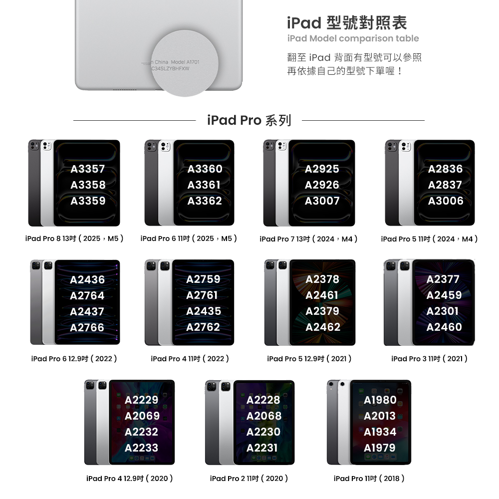 iPad 8iPad 9iPad 10 10.9吋iPad 11 11吋(2025)iPad Air 11吋(2024/2025)iPad Air 4iPad Air 5iPad Pro 11吋(2018)iPad Pro 2 11吋iPad Pro 3 11吋iPad Pro 4 11吋iPad Pro 5 11吋(2024)iPad Pro 6 11吋(2025)iPad Pro 4 12.9吋iPad Pro 5 12.9吋iPad Pro 6 12.9吋iPad Air 13吋(2024/2025)iPad Pro 7 13吋(2024)iPad Pro 8 13吋(2025)iPad mini 6iPad mini 7(2024)