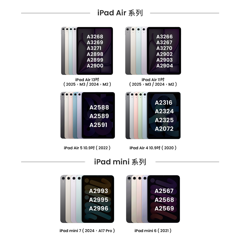 iPad 8iPad 9iPad 10 10.9吋iPad 11 11吋(2025)iPad Air 11吋(2024/2025)iPad Air 4iPad Air 5iPad Pro 11吋(2018)iPad Pro 2 11吋iPad Pro 3 11吋iPad Pro 4 11吋iPad Pro 5 11吋(2024)iPad Pro 6 11吋(2025)iPad Pro 4 12.9吋iPad Pro 5 12.9吋iPad Pro 6 12.9吋iPad Air 13吋(2024/2025)iPad Pro 7 13吋(2024)iPad Pro 8 13吋(2025)iPad mini 6iPad mini 7(2024)