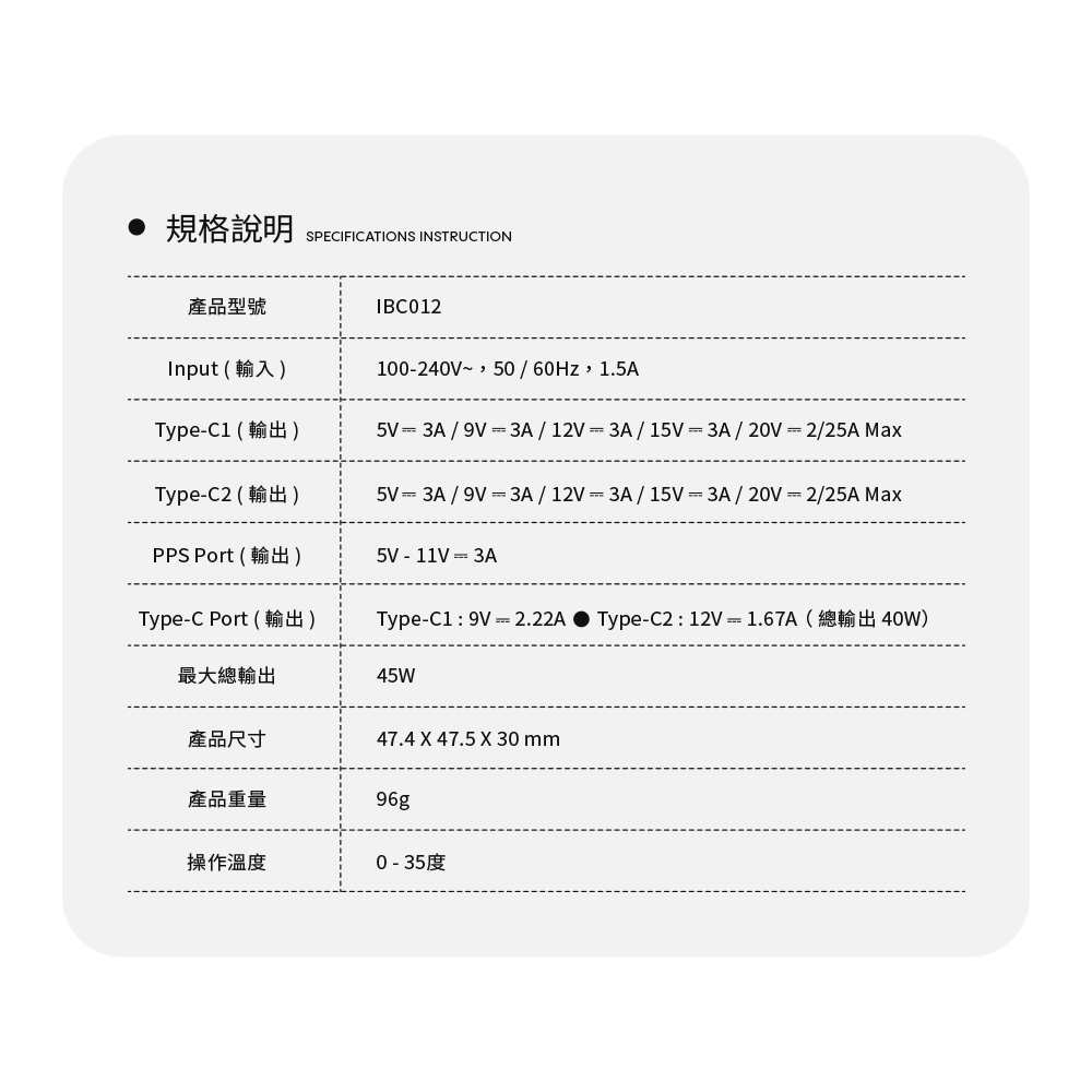 - TYPE-C1 Port:TYPE-C1:9V⎓2.22A+TYPE-C2:12V⎓1.67A(總輸出 40W)