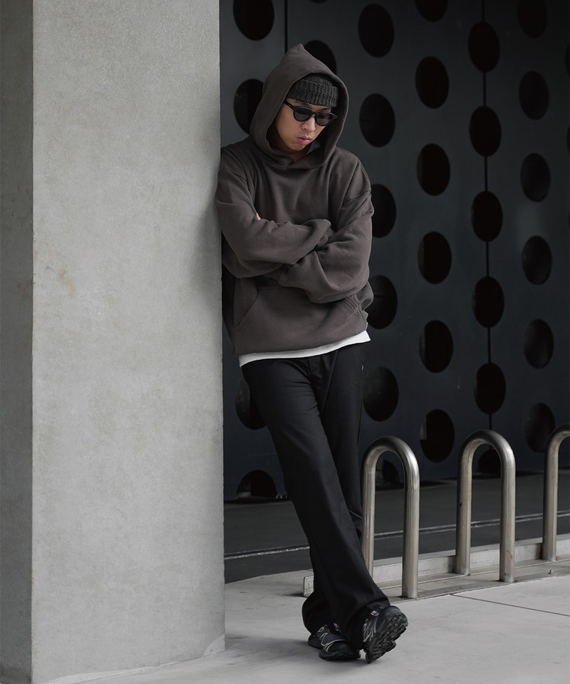 - 本次帽 T ⾯料採⽤厚磅⽑⼱布,扎實不⽣硬的質感,給予著⽤剛剛好的硬挺輪廓。