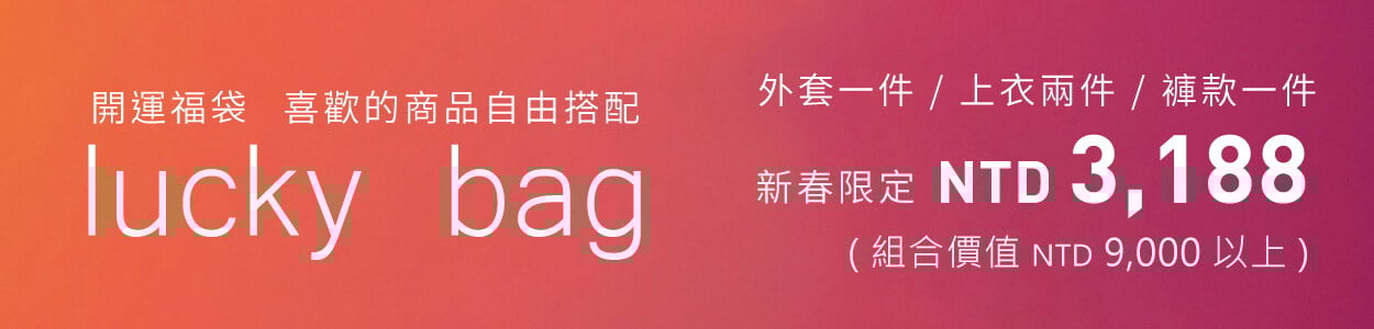 折扣優惠 【官網獨家】LUCKY BAG 開運自選福袋:外套一件/上衣兩件/褲子一件 優惠價 NTD 3,188