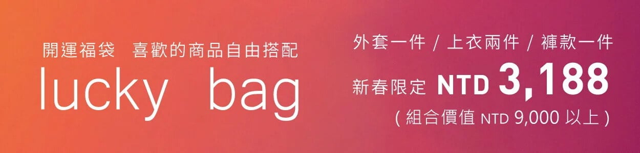 折扣優惠 【官網獨家】LUCKY BAG 開運自選福袋:外套一件/上衣兩件/褲子一件 優惠價 NTD 3,188